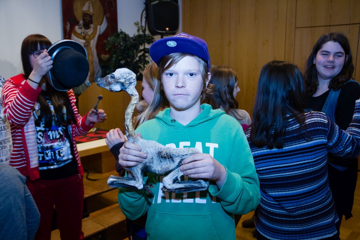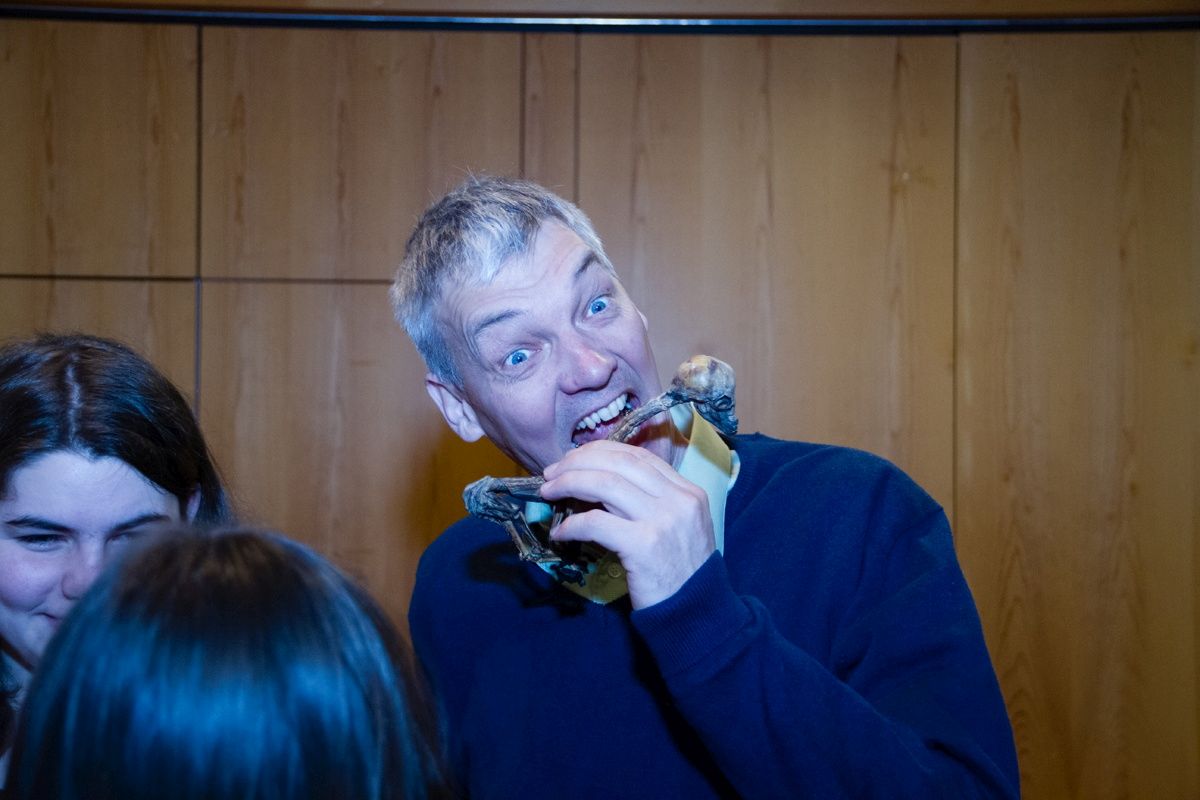 Mit seiner mitreißenden Art verstand es Helmut Pichler, die Schülerinnen und Schüler für die Vielfalt Südamerikas zu begeistern. In der Pause zeigte er ihnen natürlich wieder Gegenstände, die er von seinen Reisen mitgebracht hatte.